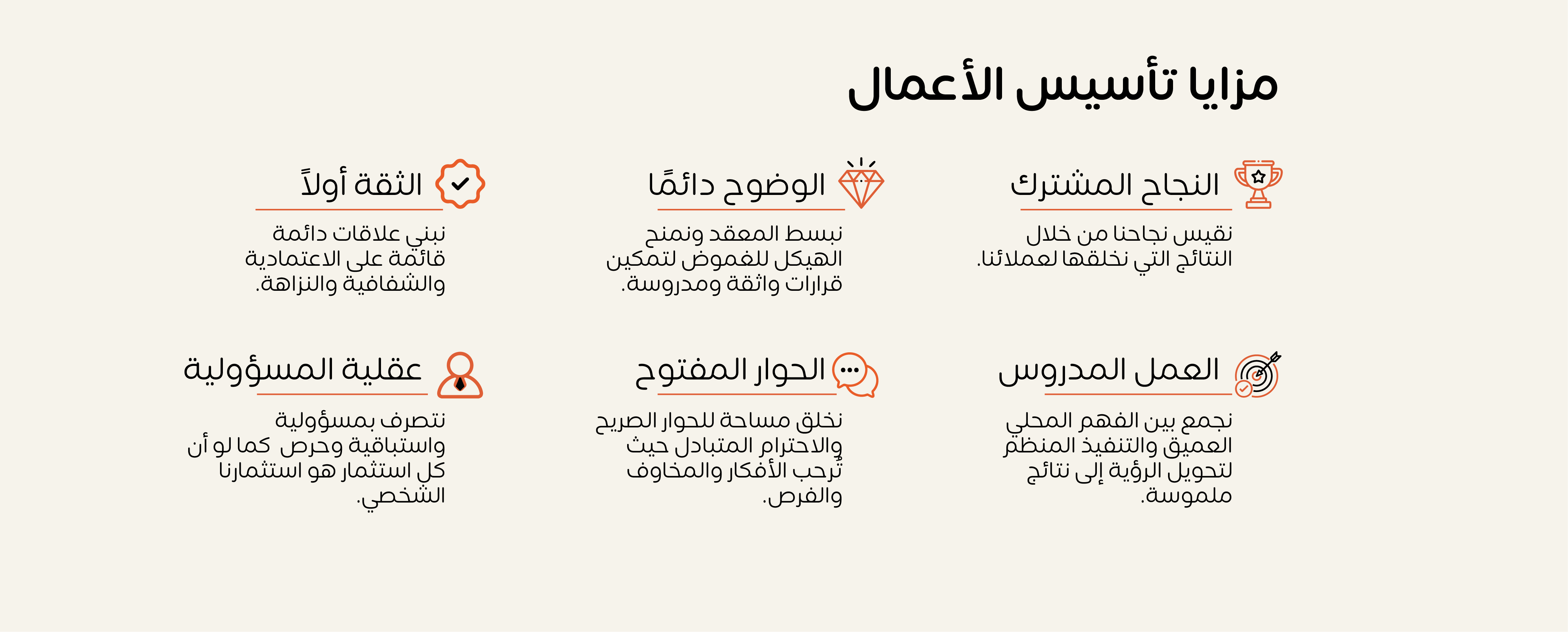 لا تحصل فقط على رخصة — بل على شريك يساعدك على الإنطلاق، والتوطين، والنمو من خلال الحدود البيضاء مع خدمات مصممة خصيصا لمسارك االإستثماري